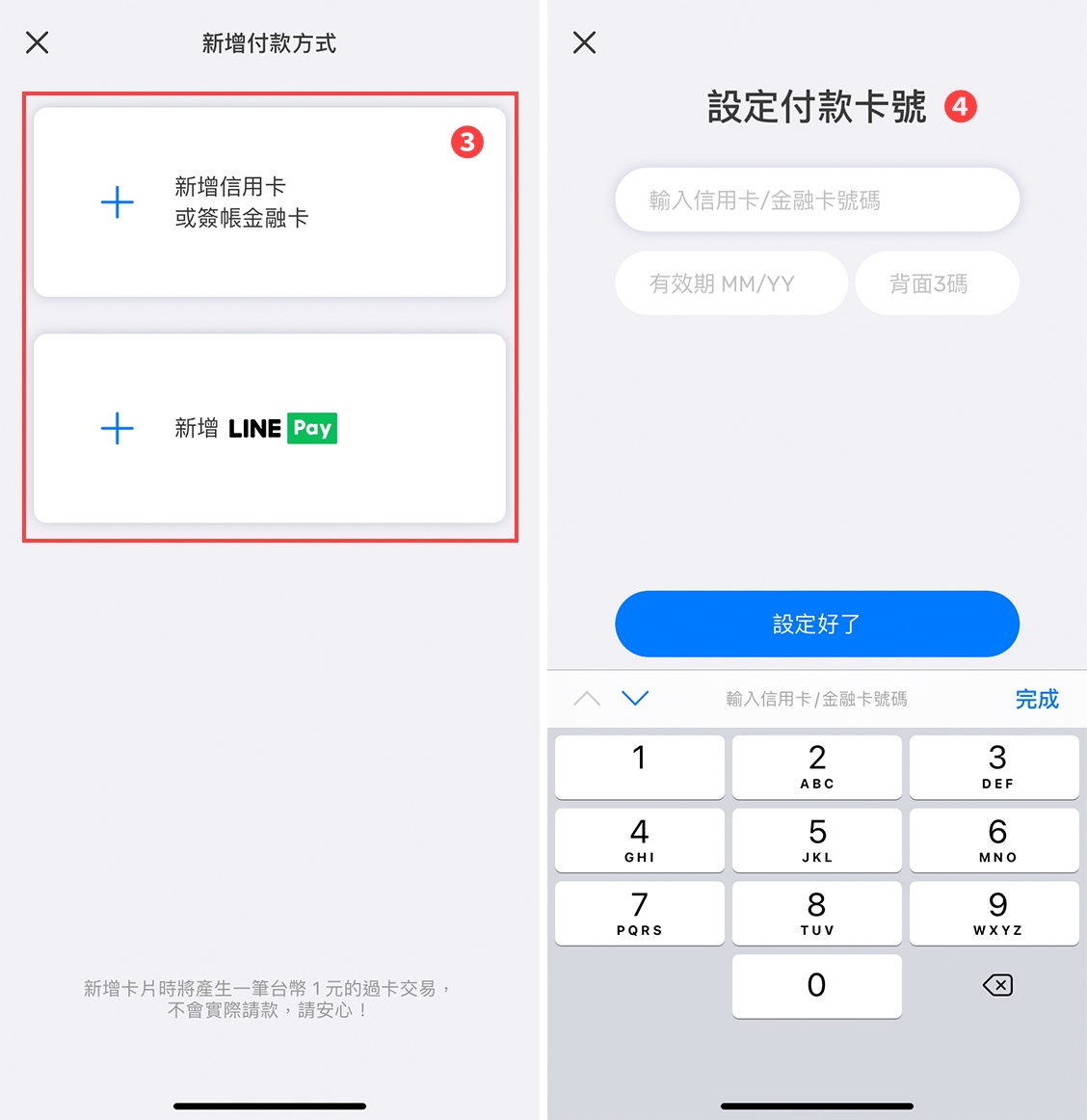 輸入信用卡或簽帳金融卡資料,輸入完畢後請按「設定好了」