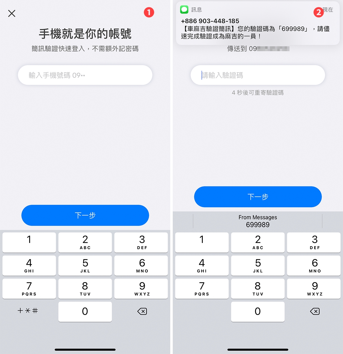 ❷ 輸入簡訊驗證碼(如未收到簡訊,可先關閉過濾簡訊的軟體、或重開機再試)