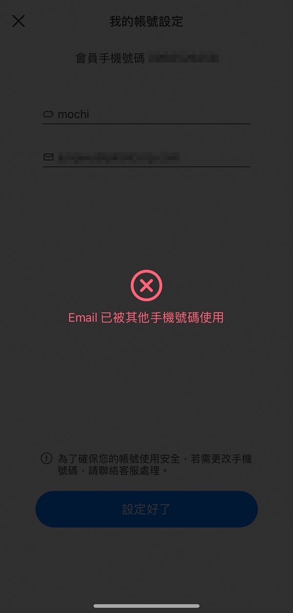 *若顯示「Email 已被其他手機號碼綁定」,常見的情況是,您在註冊時並不是輸入這個信箱(或手機號碼),如果您需要協助,請 聯繫客服 並在 問題類型 選擇「使用者資料修改」留下您的聯絡資料,我們將盡快協助您。