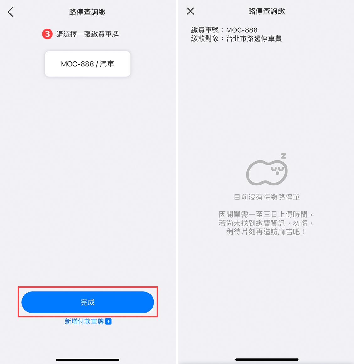選擇欲繳費的車牌再按完成即可開始查詢,或您可以即時新增一張車牌做查詢